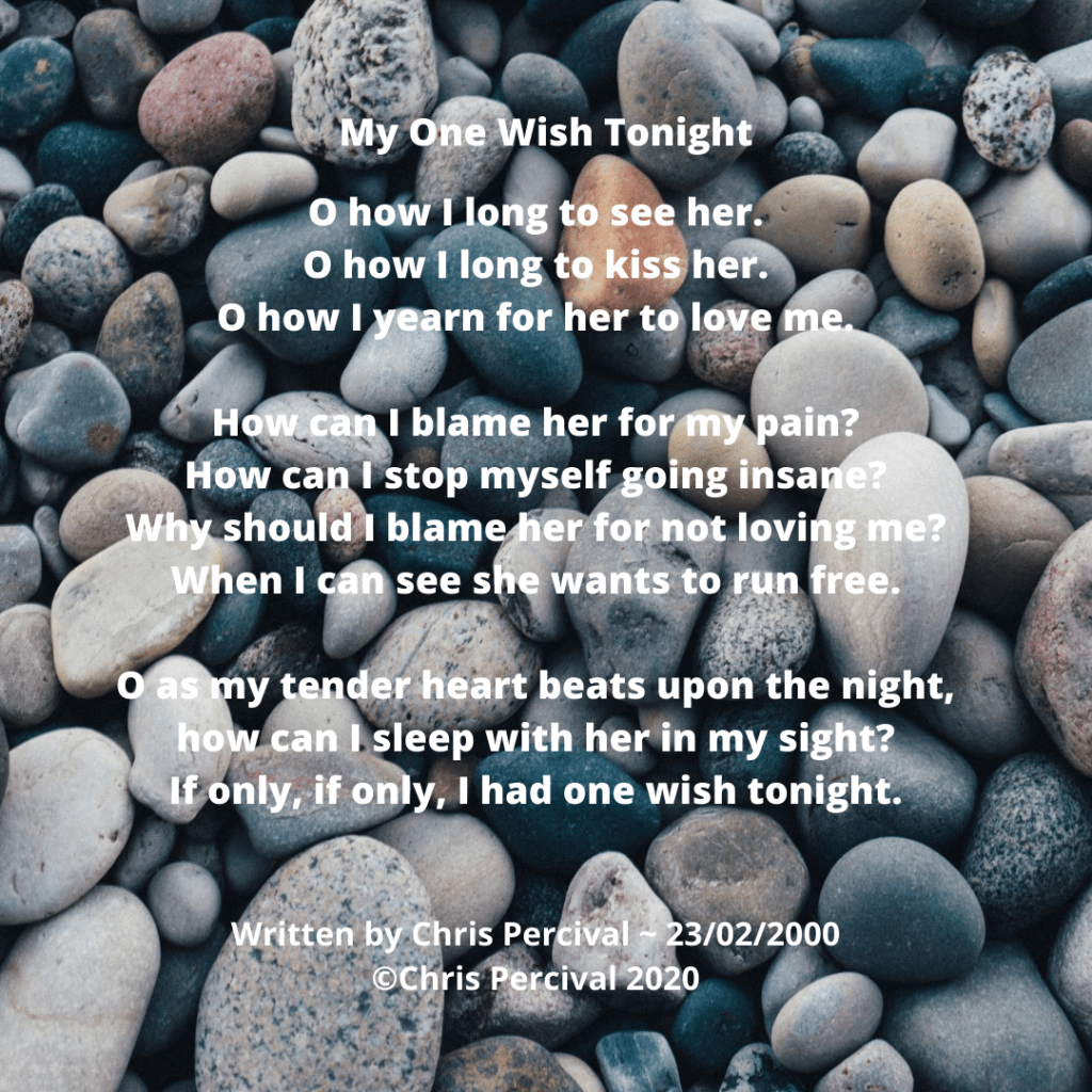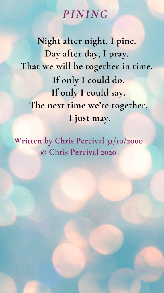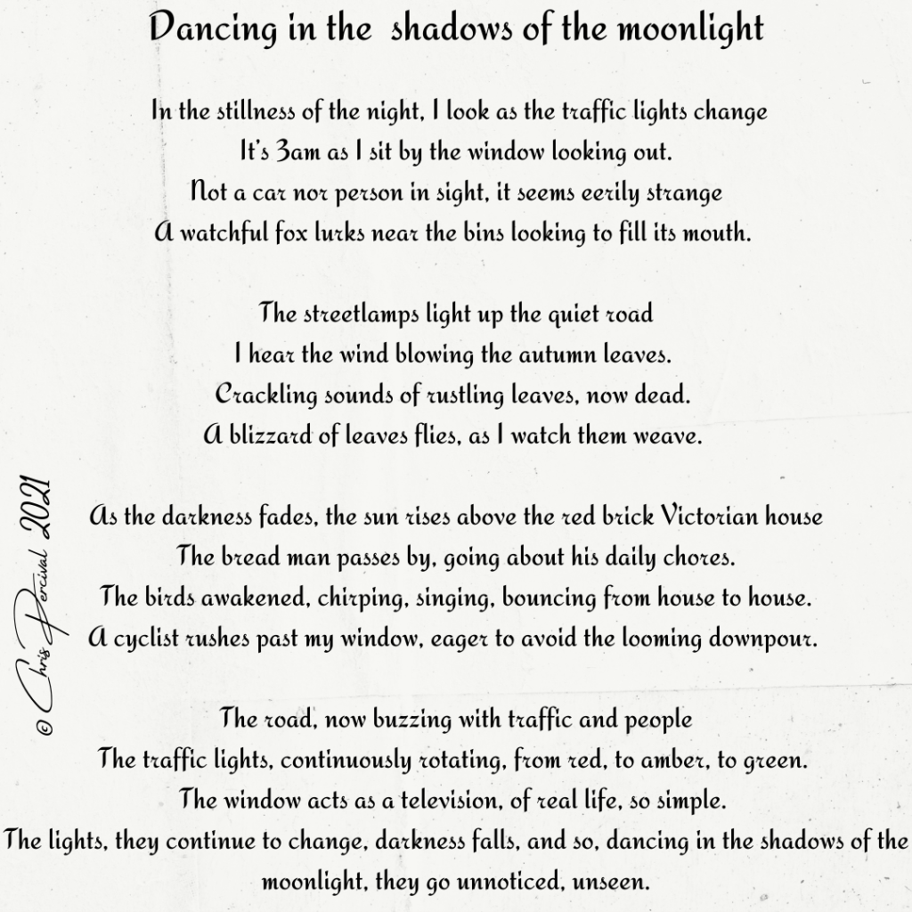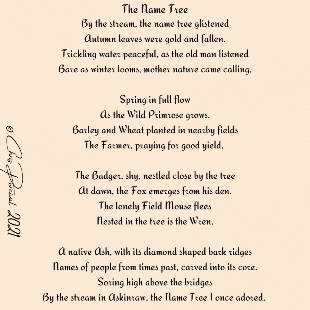 These Old Hands.Dancing in the Shadows of the Moonlight.The Name Tree.Lone Wolf.The Prison.Find Your Fire.AfterglowAwakened Flowers. Dedicated to Gail Symmons – for her love of all things Horticulture. 🌻The Clique.BrotherDedicated to Stephen ‘Puny’ Potts. Love NotesA Beautiful Soul. Dedicated to Michelle Oglesby.A poem dedicated to the homeless.Love Letters.This poem is about toxic shame within families and moving forward from it. Toxic shame can be damaging to the individual when that person loses their sense of self. In order not to transfer or project this toxic shame it is important to break the chains of shame that binds you. This poem is dedicated to Mr. Laurence O’Reilly.This poem reflects on how one can lose their identity and individuality and the price they may pay in doing so. By being frozen in a state of being the author talks about avoiding egregious and irretrievable ways. In order to do so, one must play the game of life.Here the poet attempts to tackle the stigma surrounding mental health that he perceives and discuss topics such as depression and his own struggles. Themes such as emptiness, loneliness, reflection and connecting with people are further discussed.This poem is dedicated to survivors of Sociopaths. Love NotesLove NotesLove Notes Love NotesLove NotesThis poem is dedicated to my mum, Essie Percival who sadly passed away 21st October 2020.This poem describes how young teenage boys were inspired by their school teacher to excel in both sport and life. The poem is dedicated to Mr. Sean McEvoy, Teacher in the Curragh Post-Primary School, Co. Kildare.This poem explores the pain and sorrow of losing a loved one. The poem is dedicated to my dad, Patrick Percival. Childhood memories. 😊This poem centres around the topic of young love. The butterflies, excitement and pinning all rolled in to an emotional roller-coaster! A poem about a magical moment or connection between two people.There’s someone perfect for everyone!