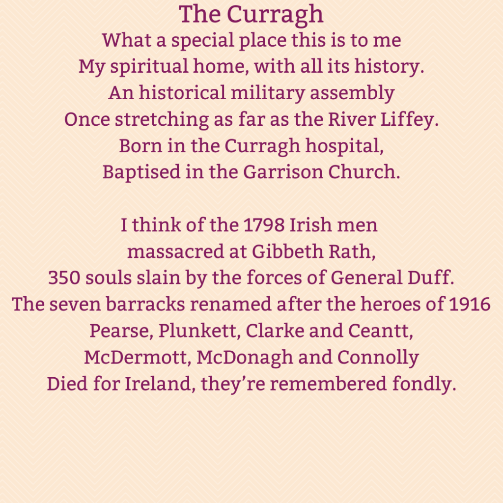 The Curragh is a very special place to me. I was born, baptised and went to the Curragh Post-Primary school. (And many other things!) My mam and dad also lived in the Army’s Married Quarters before we moved to Suncroft. It has such a beautiful, unique landscape that is complemented with a richness of various colours throughout the different seasons. It truly is a wonderful place. My spiritual home. I’d like to dedicate this poem to my brother Ciarán who sadly passed away on 13th May 2022.